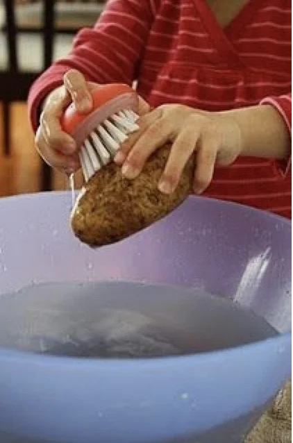 نشاطين مختلفين يتعلم الطفل من خلالهما ان يغسل باستخدام فرشاة. ممكن تقديم النشاط بأكثر من شكل. يعني مثلاً نتدرج في حجم الفرشاة و ننوع في الأشياء المطلوب غسلها: مثلاً حبة بطاطس أو جزر او حجارة او نموذج حيوان بلاستيك... إلخ. و طبعاً لأن النشاط فيه استخدام ماء يرضي عند الطفل حاجته الحسية